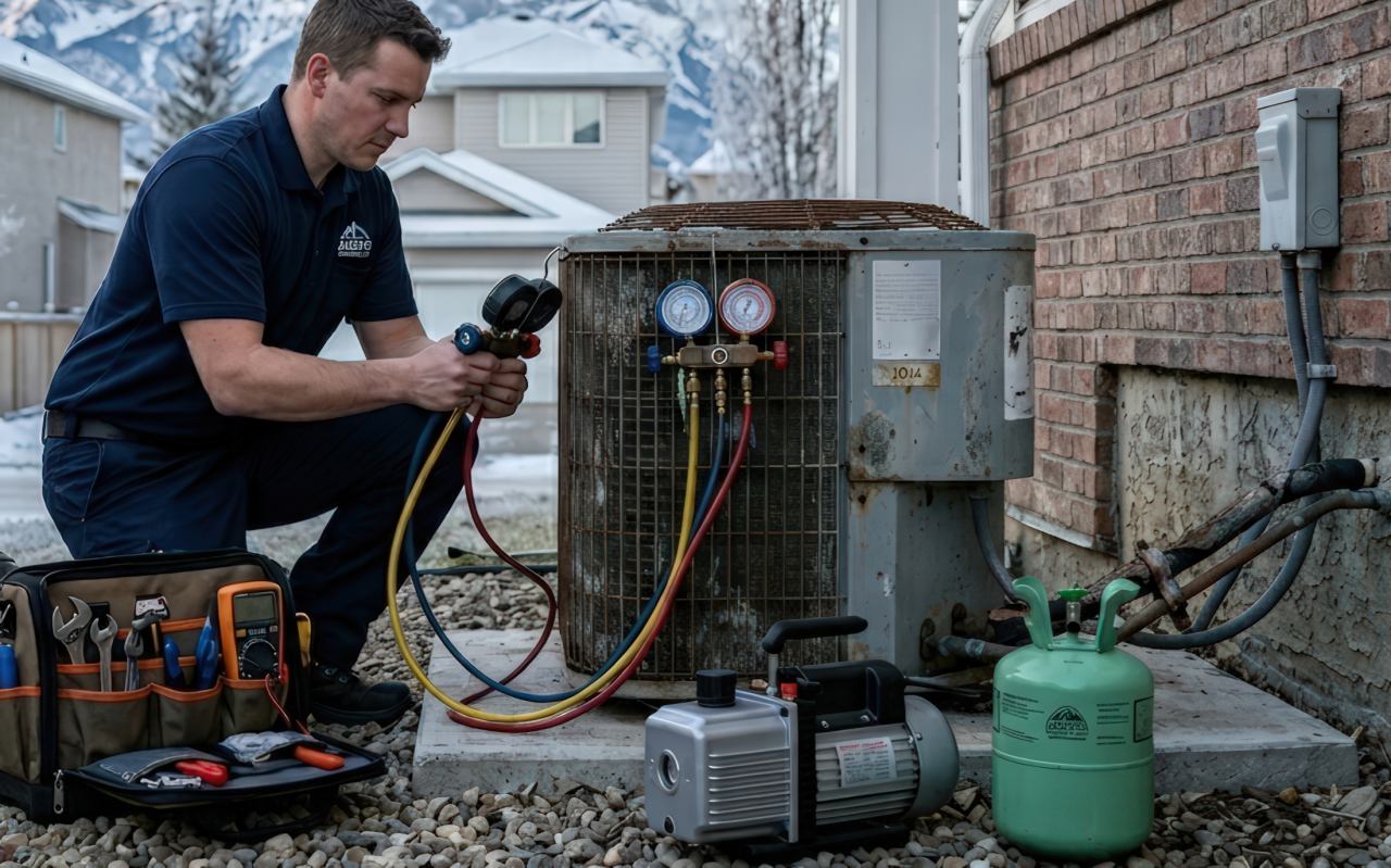 HVAC technician diagnoses aging cooling system at a residential property with manifold gauges during snowfall.