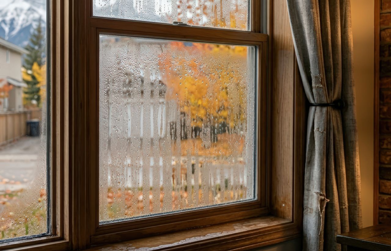 Interior window with moisture buildup on glass panes revealing a backyard with autumn colors and residential fencing outdoors.