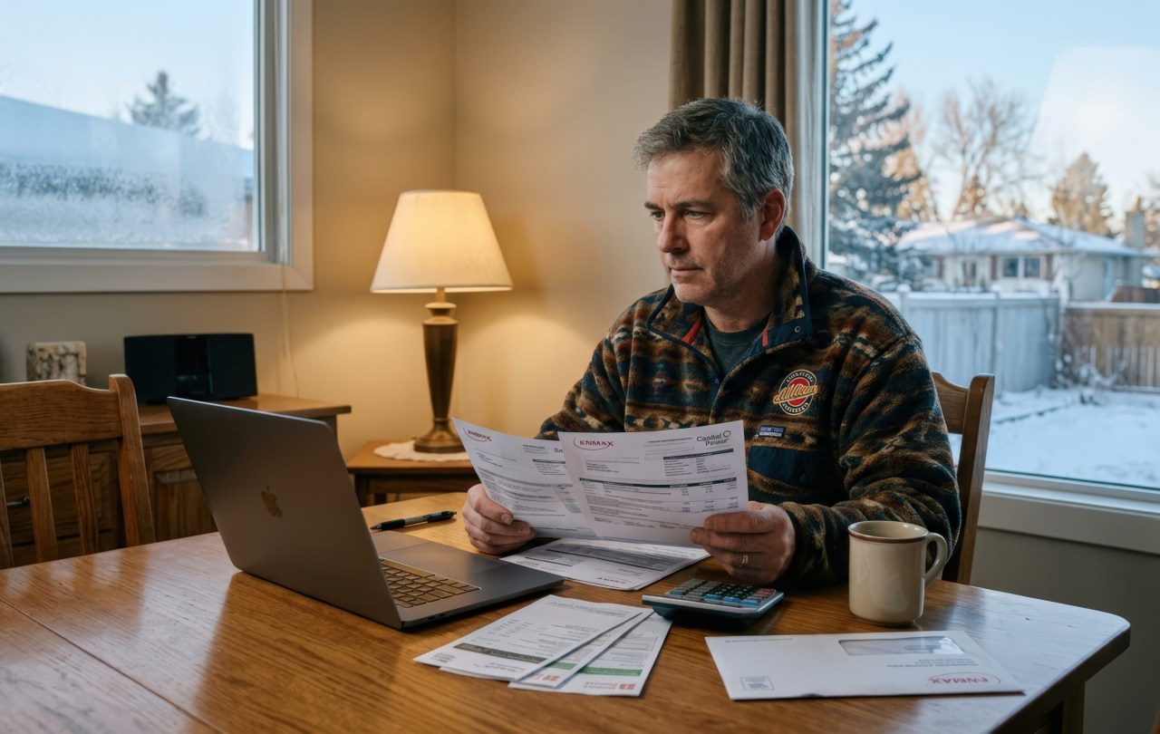Middle-aged man sits at a wooden dining table reviewing multiple utility bills and financial statements while a laptop, calculator, and coffee mug rest nearby.