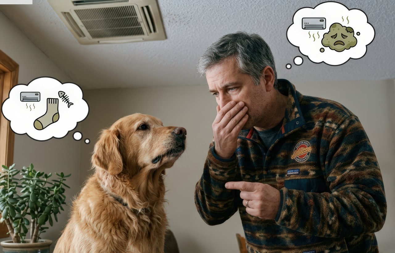 Golden retriever and man in plaid fleece react to air conditioning odors depicted in illustrated speech bubbles above them indoors.